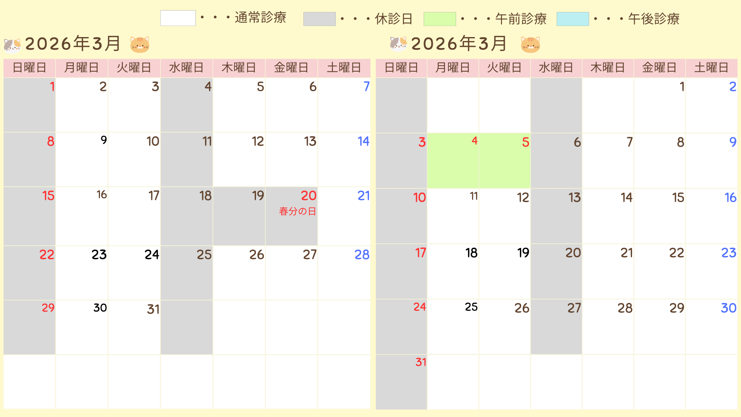休診となりますのでカレンダーをご確認ください。