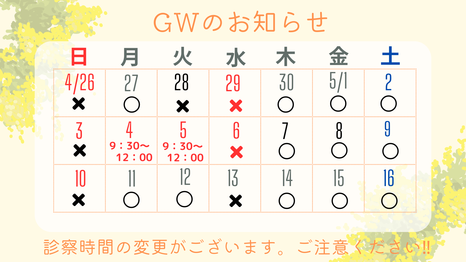 2026年GWの診療時間について